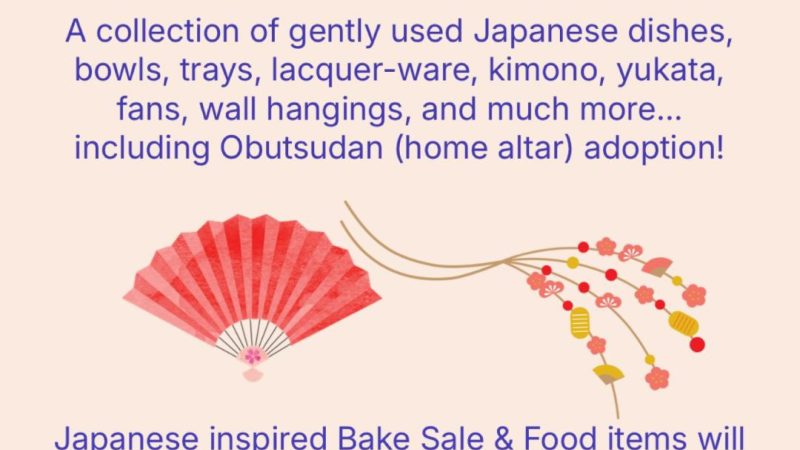 read moreSaturday, May 2, 2026 10:00am to 2:00pm A collection of gently used Japanese dishes, bowls, trays, lacquer-ware, kimono, yukata, fans, wall hangings, and much more … including Obutsudan (home altar) adoption!